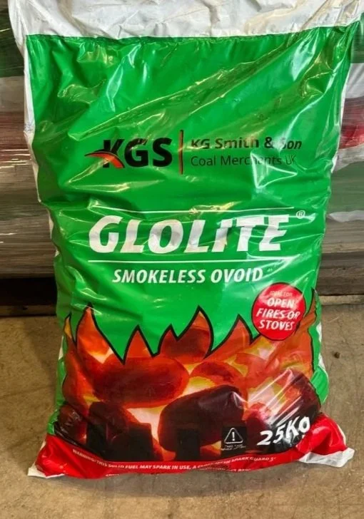 25Kg GloLite smokeless coal. Approved for all smokeless areas. Ideal for use on open fires, multi-fuel stoves, room heaters and cookers. Give high heat and low ash.