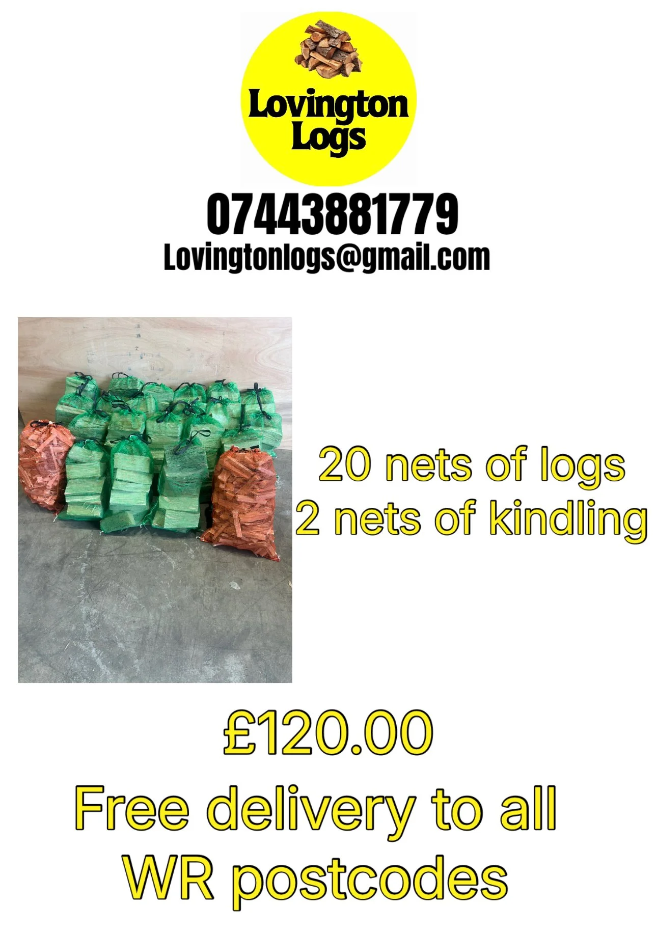We can supply large bulk orders. From our kindling nets, log nets and bulk bags. All orders are priced individually to include delivery. Please contact us to discuss. We can offer this outside of our delivery area below.