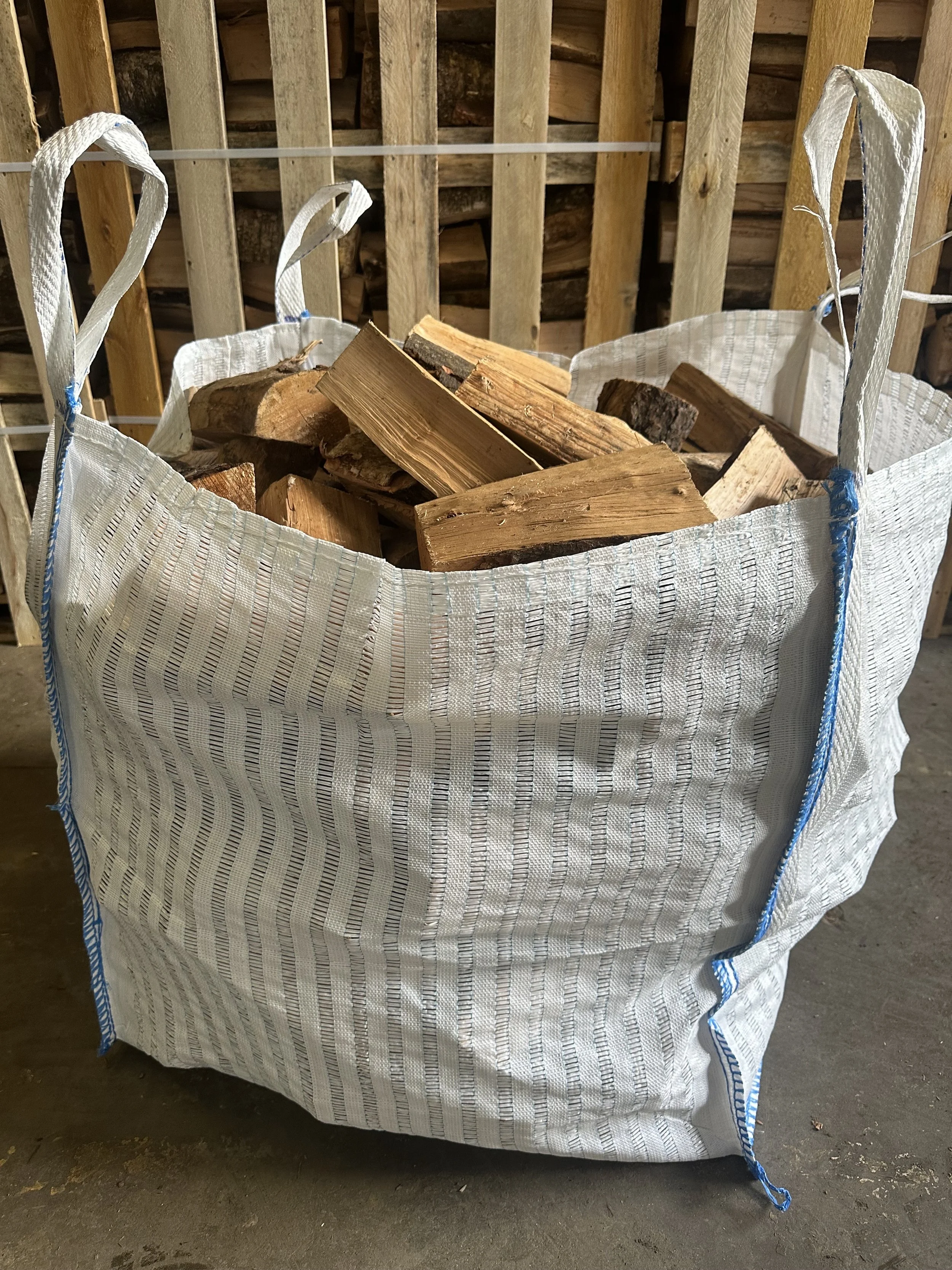 These bulk bags are 80 x 80 x 80 and delivered filled with our premium kiln dried logs. Perfect for wood burners, pizza ovens, fire pits and the like.